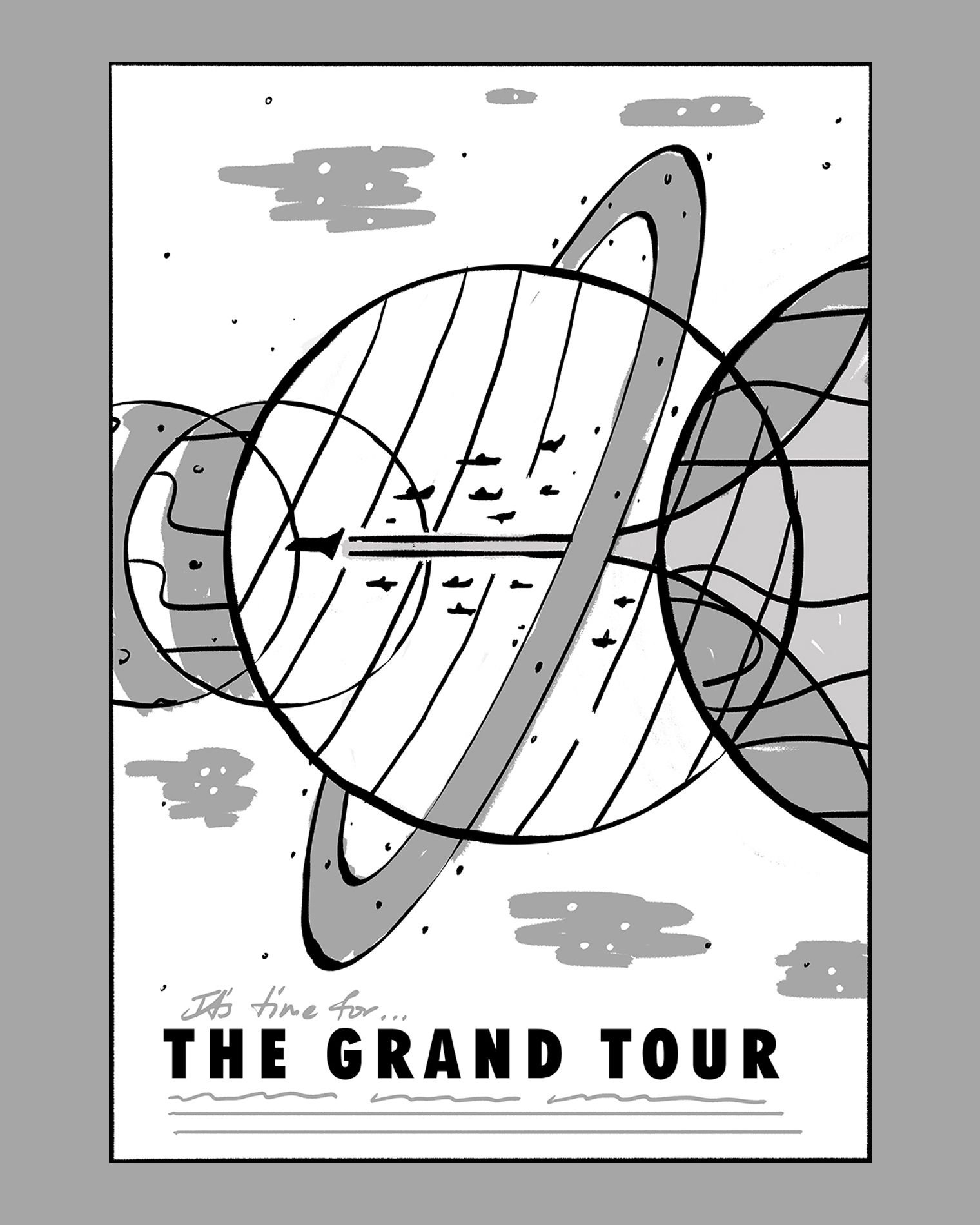 Initial composition ideas for The Grand Tour poster